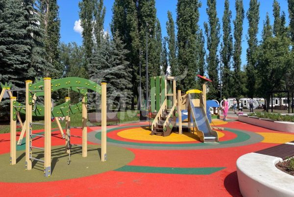 Мягкое и бесшовное покрытие с хорошей амортизацией. Часто применяется на детских площадках и возле спортивных зон. Снижает риск травм при падении, имеет нескользящую поверхность. Недостатки — возможное выцветание, запах при сильной жаре и ограниченная долговечность под интенсивной механической нагрузкой.